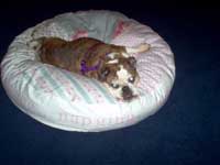 Dearest Babydoll....We knew we loved you the minute we saw you. The night of September 14th, you passed away, and we knew then we loved you far and above what we ever imagined. You came into our lives afraid to trust,and tested us often to see how we would treat you. We loved you unconditionally...Finally one day it clicked for you,and you knew you were in a safe place. We had earned your trust. You then became your real Babydoll self. A precious little bully girl. We had such good times together. You loved cheese,treats,and most of all "bye bye" rides. We said that word and we best have our shoes on and be heading out the door with you. We would throw your little diva bed in the back of the Beetle Bug, and off we would go. You didn't care if we were going for coffee, to the pumpkin patch or to visit Grandma Betty at the nursing facility. After all you did save her life the first week you came to live with us...You were truly Heaven Sent. A gift. We will cherish our memories with you forever, and we will never forget you. You made a beautiful difference in our lives by being here and being part of our family. You will remain in our hearts forever.....How could you not, for your paw prints are all over them...